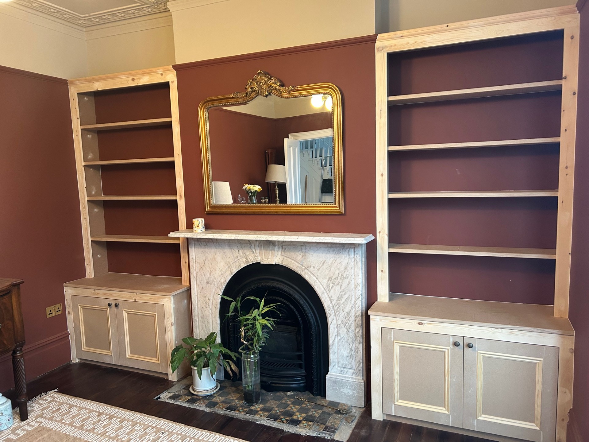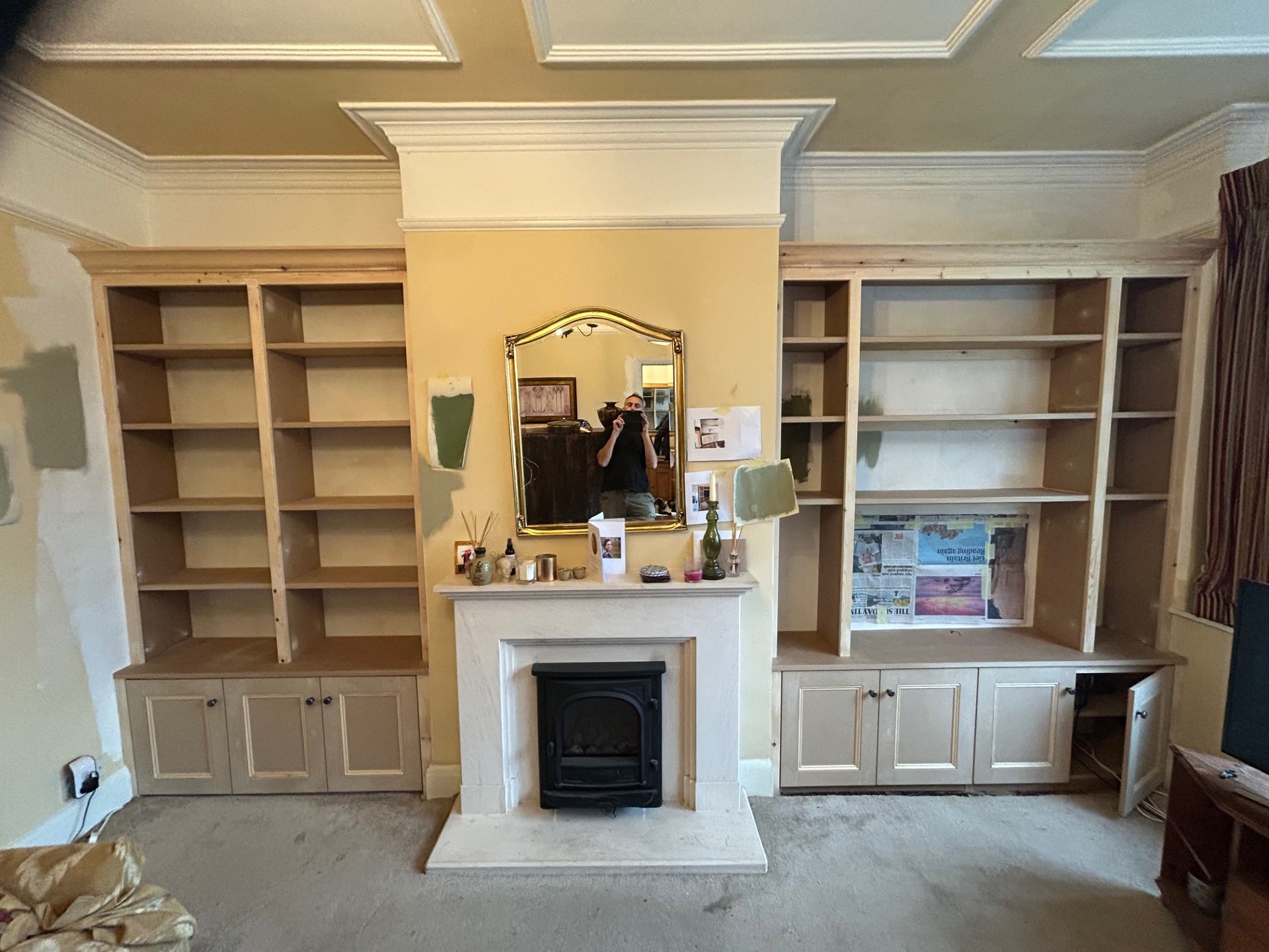 2 very wide alcoves fitted out with Shaker doors and framed bookcases.