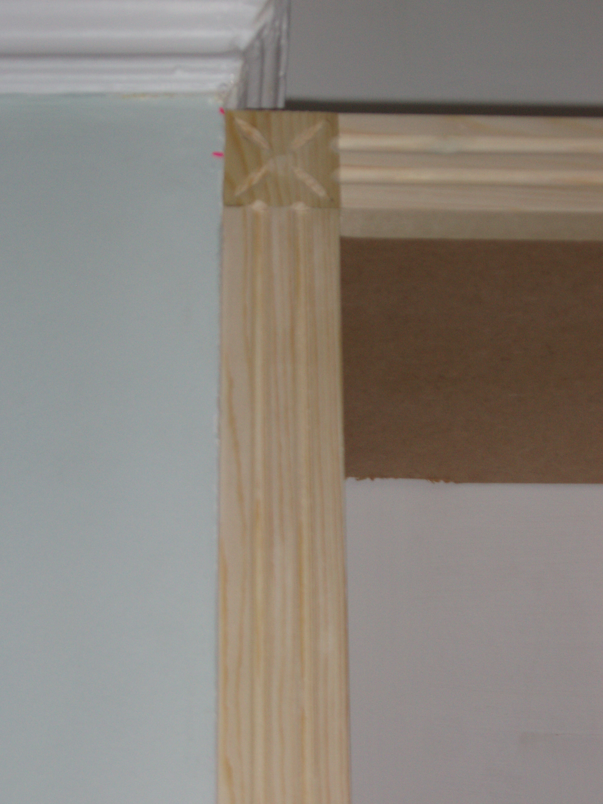 Flower Timber BlocksThis is another alcove bookcase unit with a cupboard at the bottom. This was one of two constructed in timber and MDF, the other unit had a T.V fitted above the cupboard. The client wanted decorative timber blocks on the corners of the upper bookcase unit so I had to hand carve so delicate flower style blocks. Unbelievably once I’d finished I still had ten fingers!