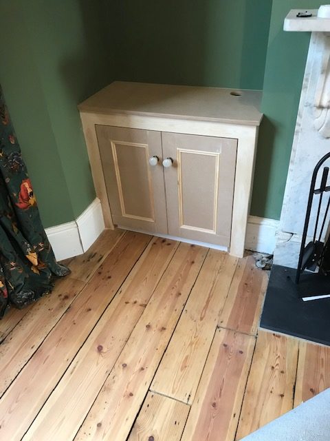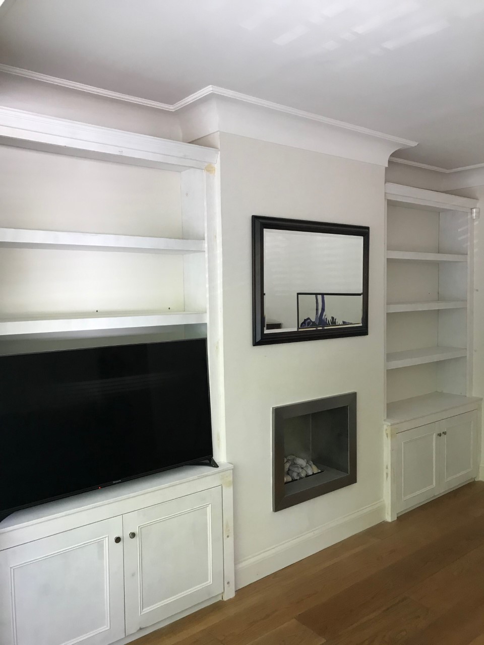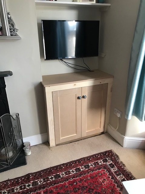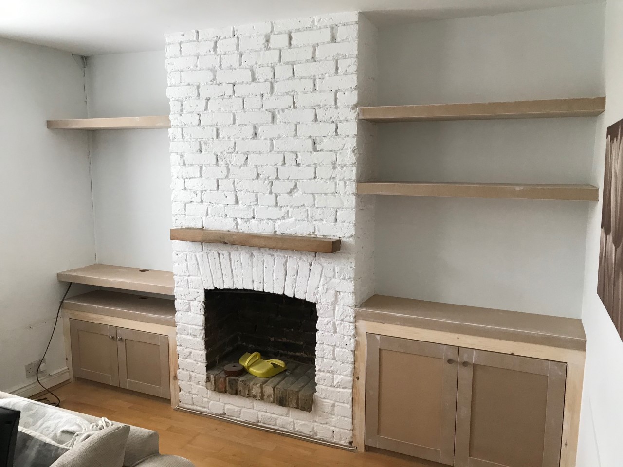 Simple TV cupboard with floating shelves fitted in both alcoves.