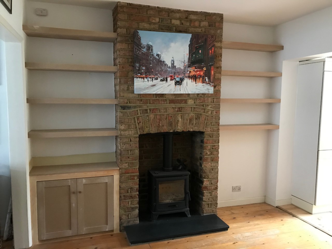 Floating shelves fitted into both alcoves with matching cupboards fitted at the bottom....