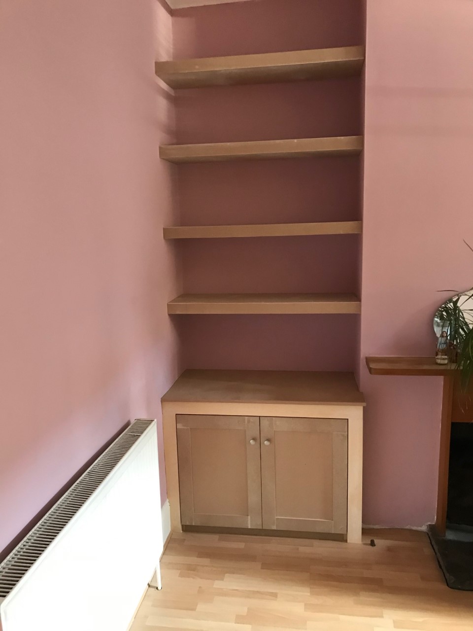 Two alcoves fitted with floating shelves. Nice neat cupboard on one side in a Shaker...
