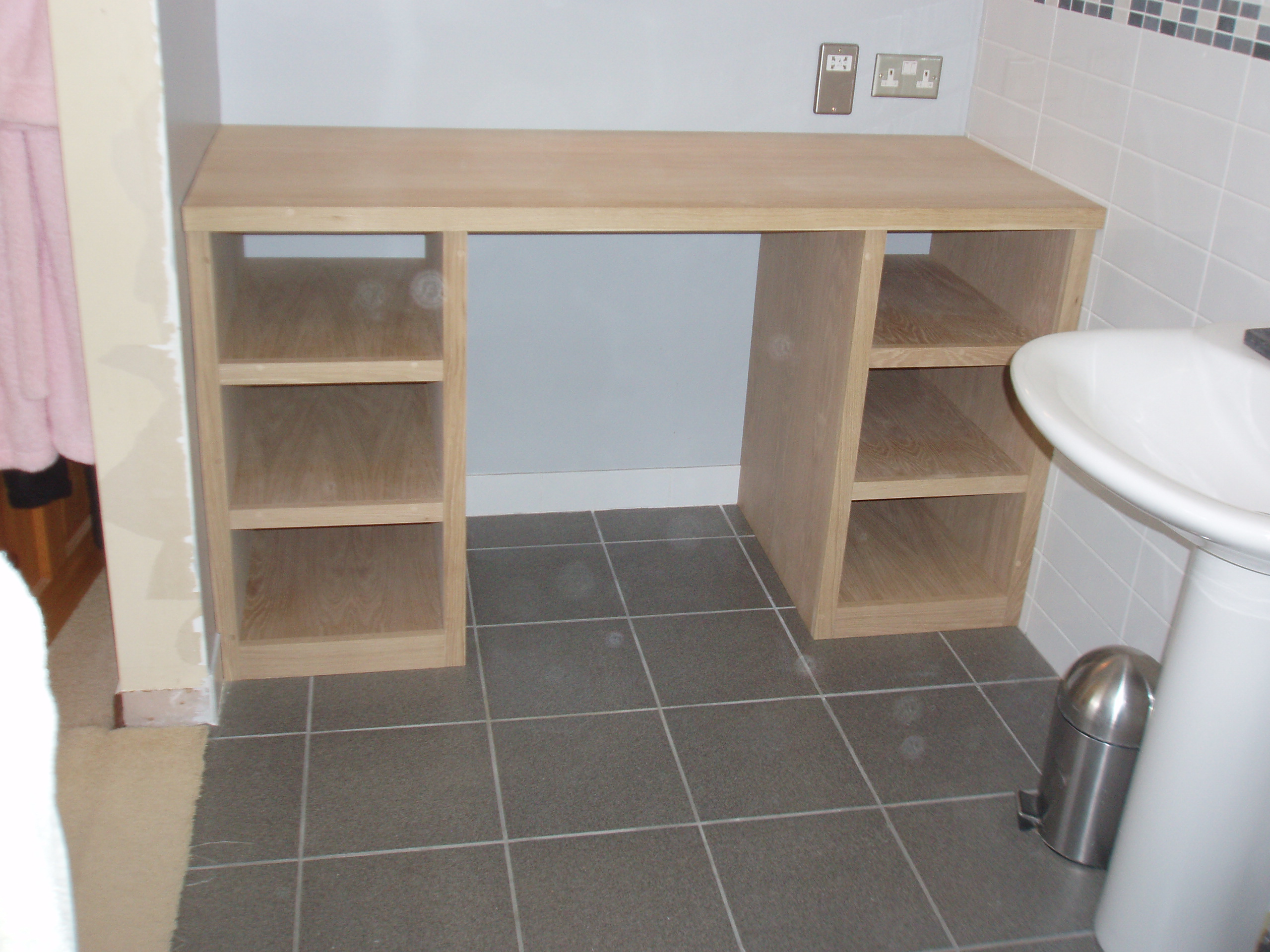 This is a dressing table fitted into a bathroom constructed in solid and oak veneered...
