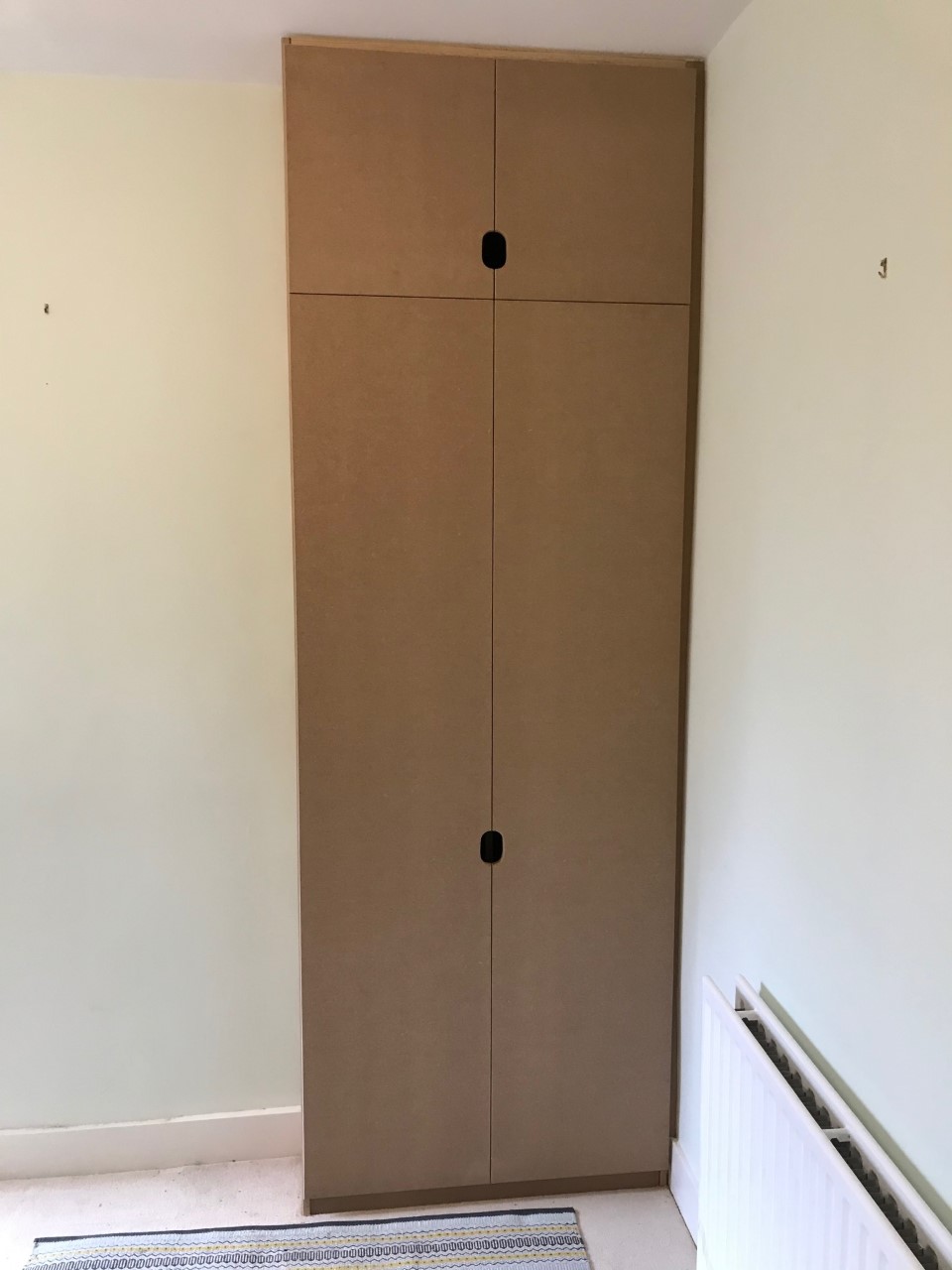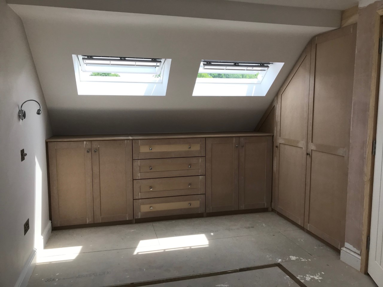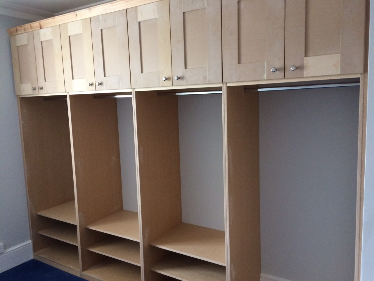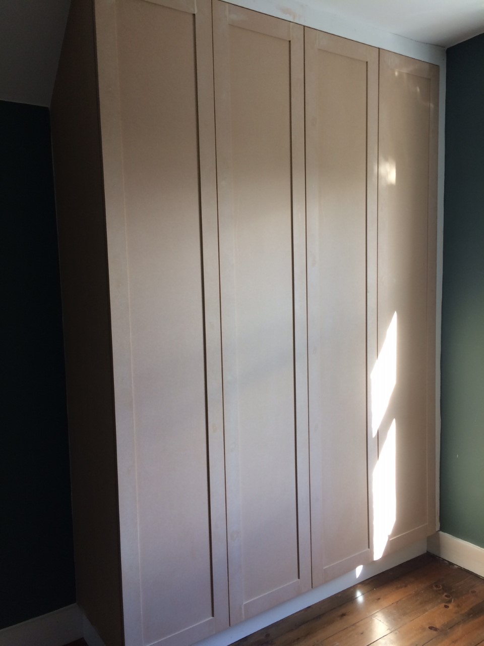 Floor to ceiling Shaker style wardrobes fitted in both alcoves. All in MDF.