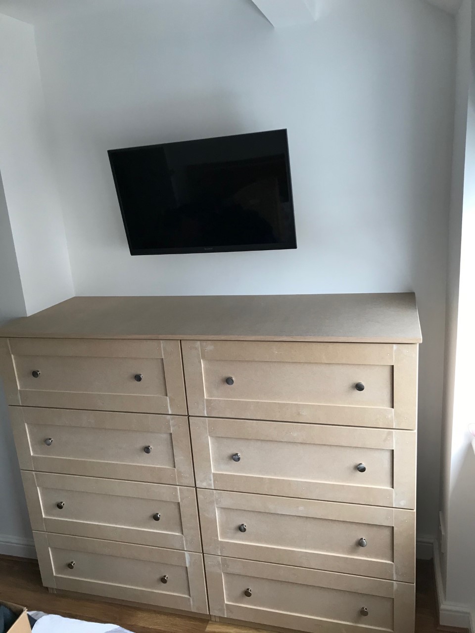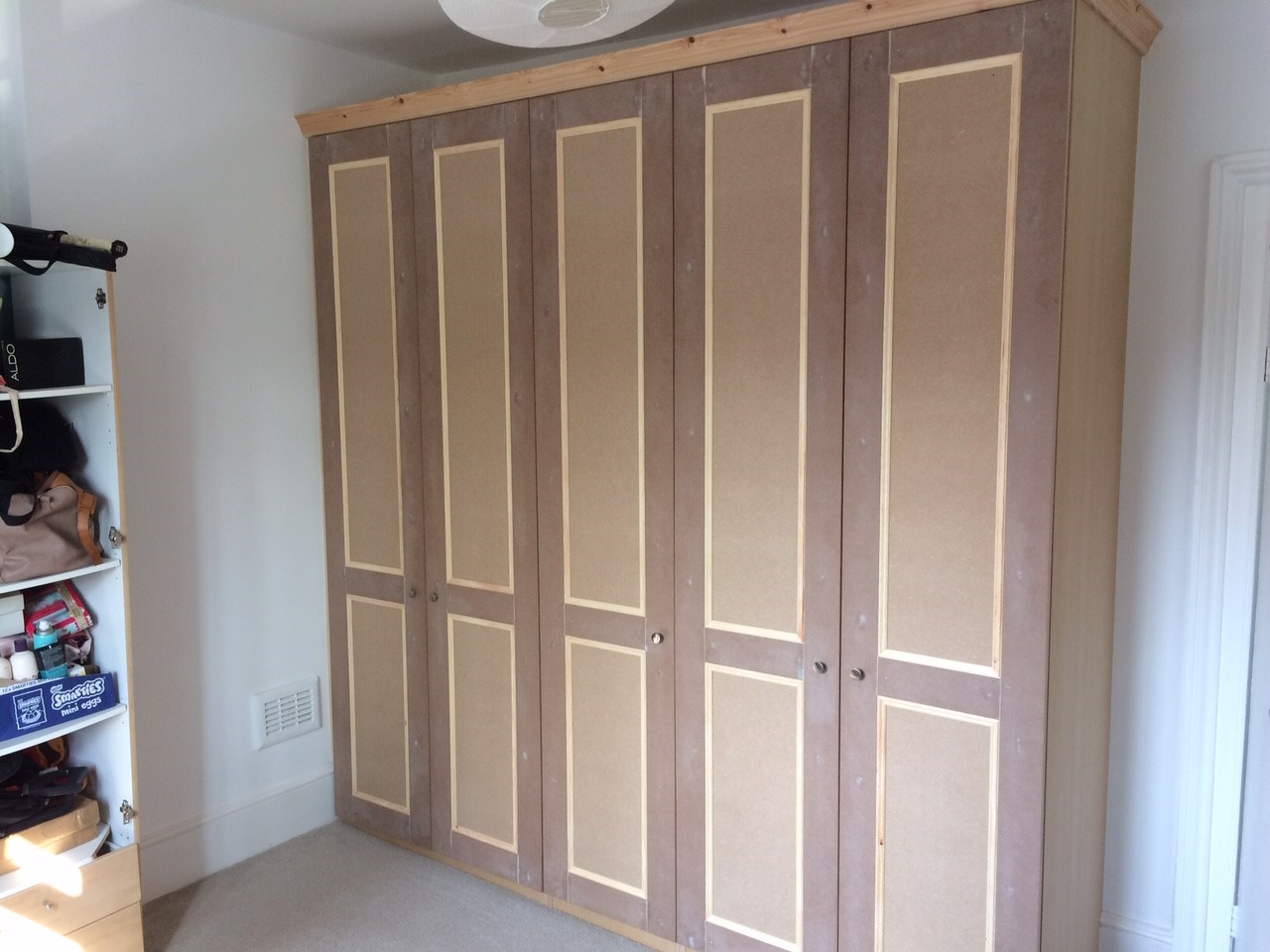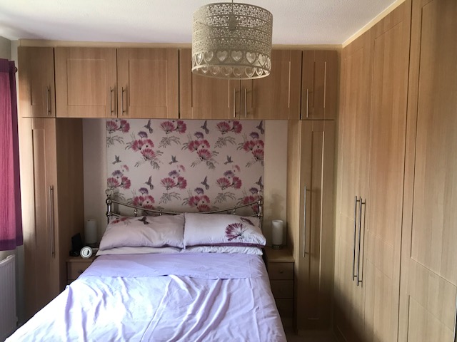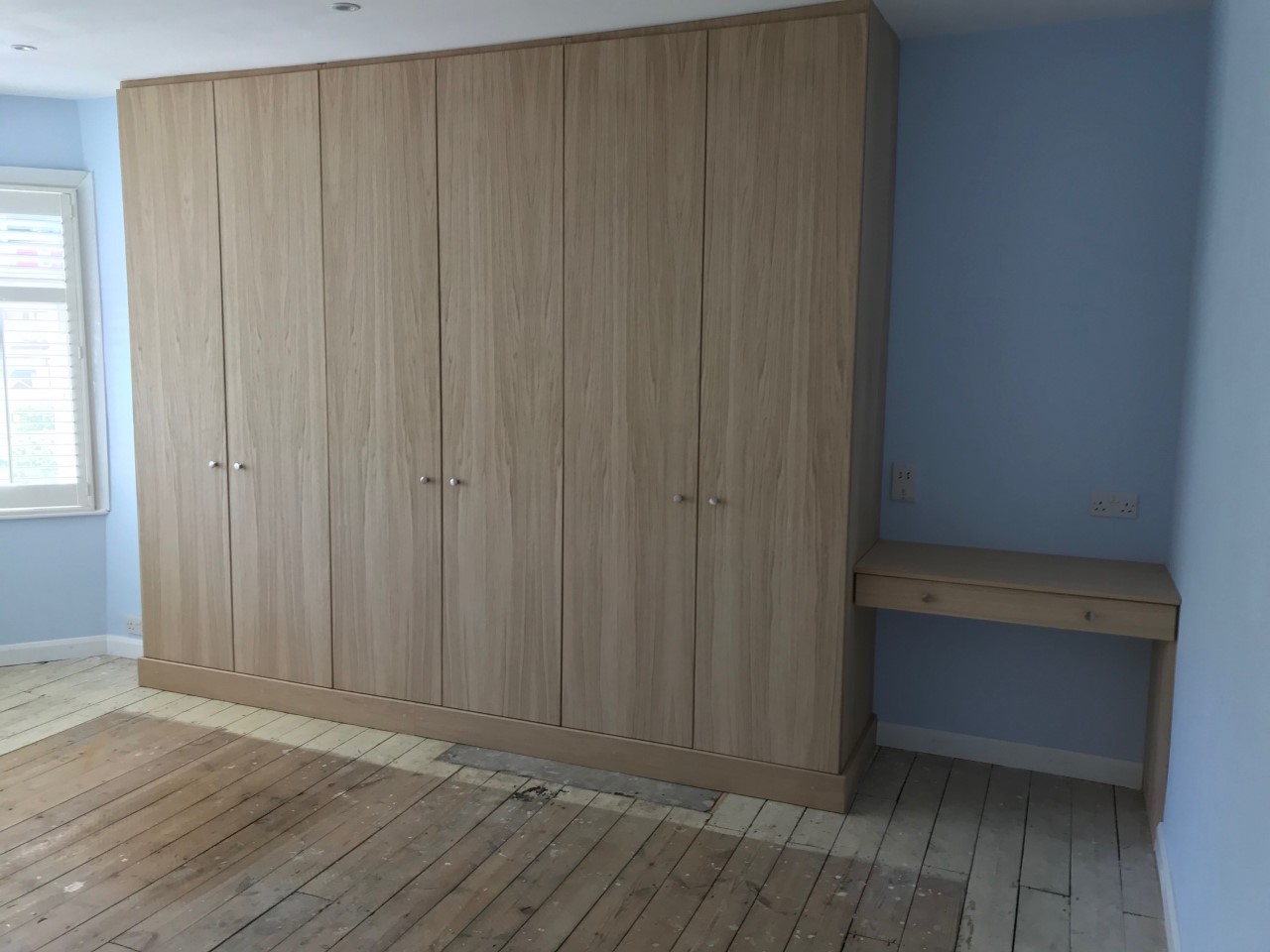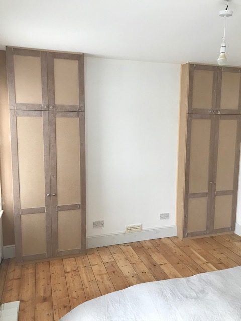 Floor to ceiling Shaker style wardrobes fitted in both alcoves. All in MDF.