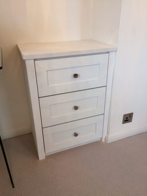 Small and compact set of drawers. In primed white, constructed in timber and MDF.