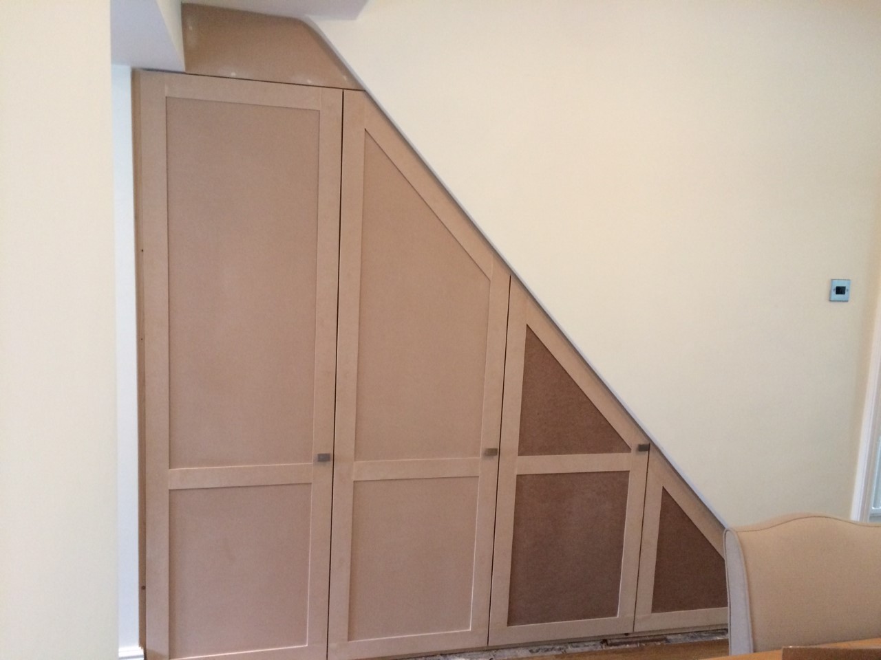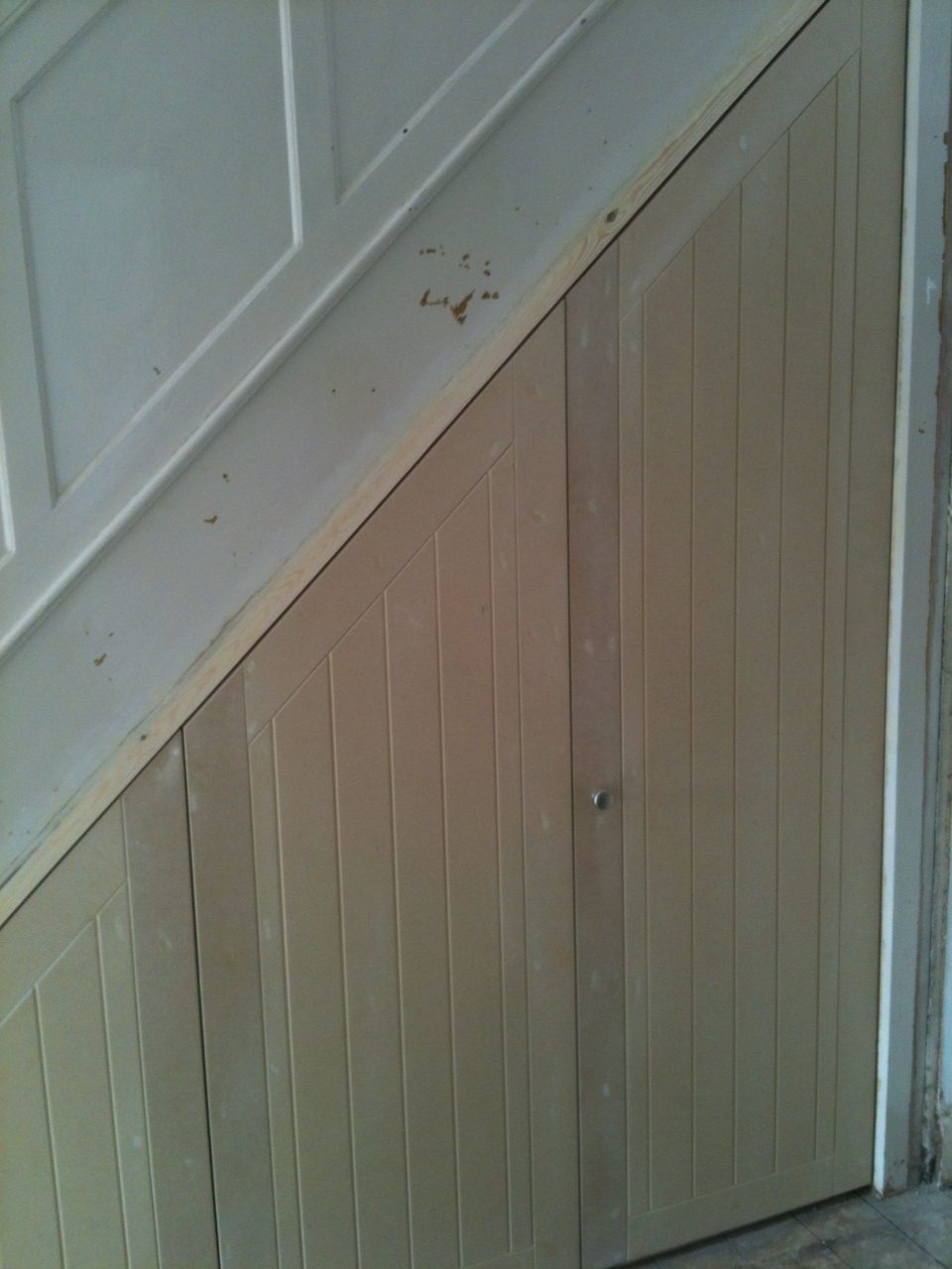 Out with the old and in with the new. New tongue and grooved looking under stairs...