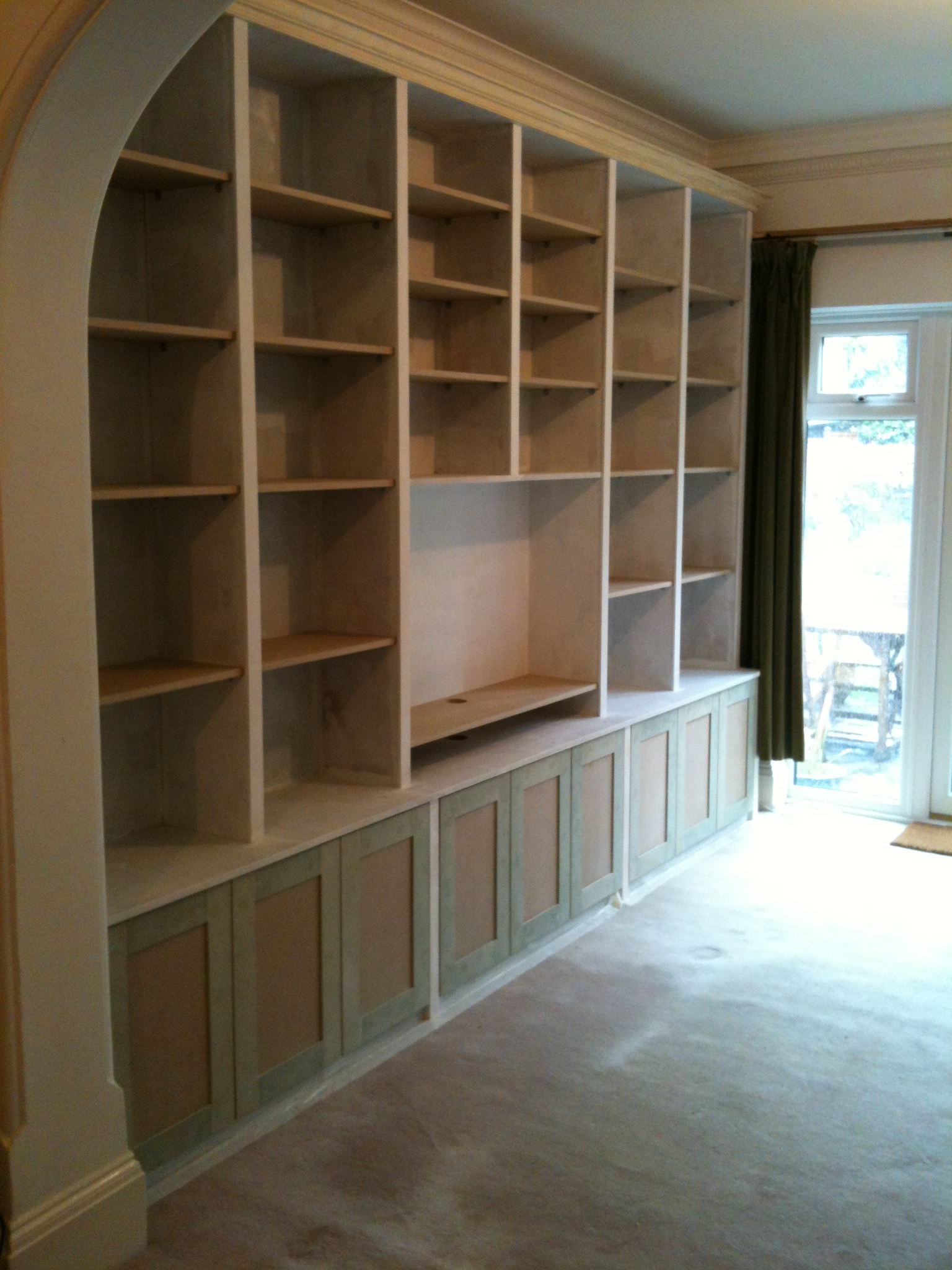 Here’s a bespoke bookcase unit in primed MDF with timber detail across the top....