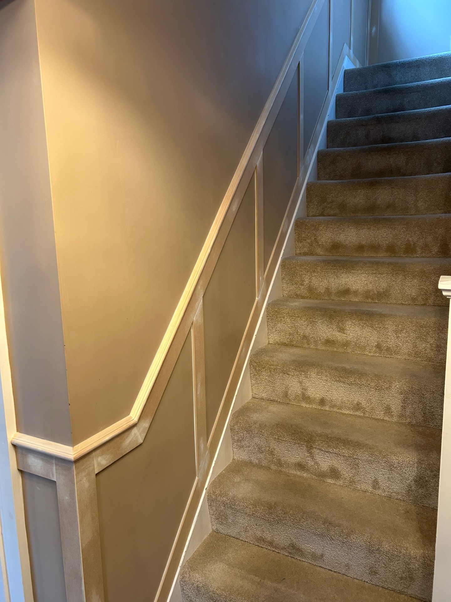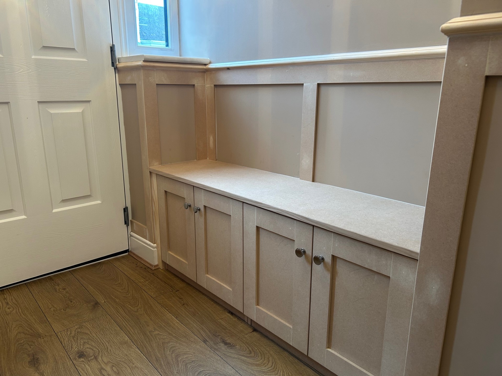 Shaker style wall panelling. Also created a bench seat for storage.