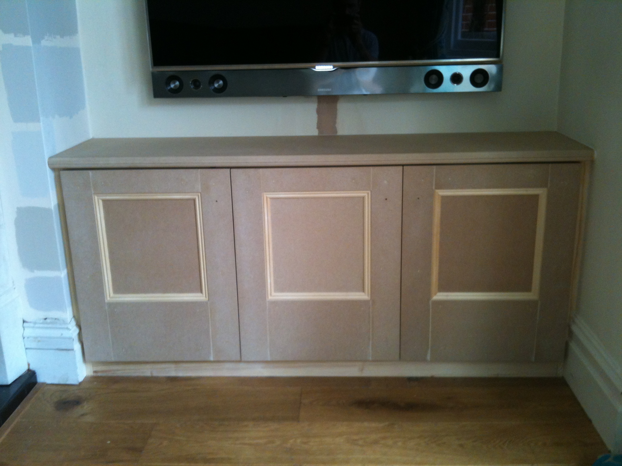 This is a TV unit to size and design. It has three touch open doors with shelves inside....